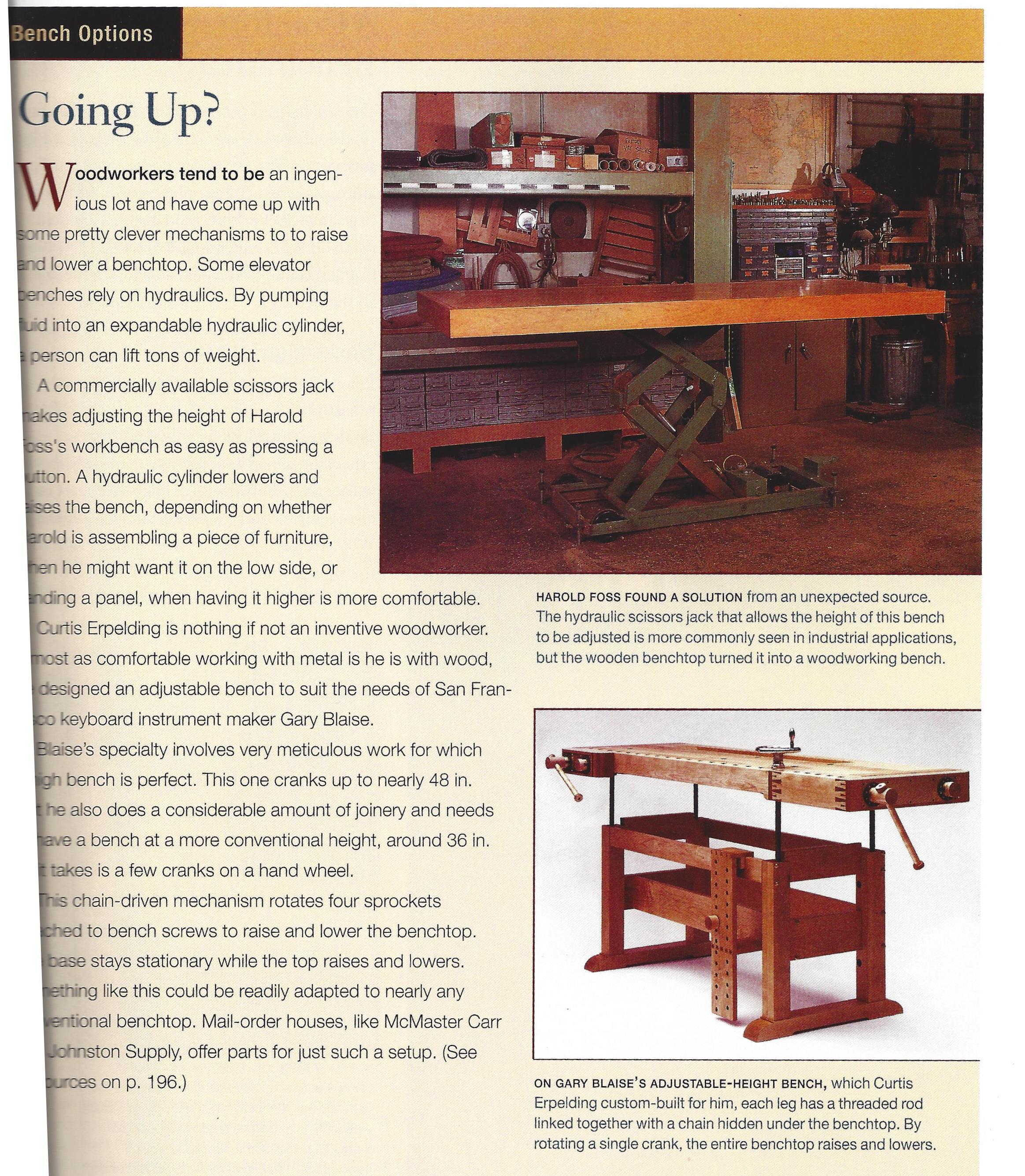 There are some plans for an adjustable woodworking bench available to buy online here: http://www.jack-bench.com/workbench%20plans%20-%20workbench%20videos.htm